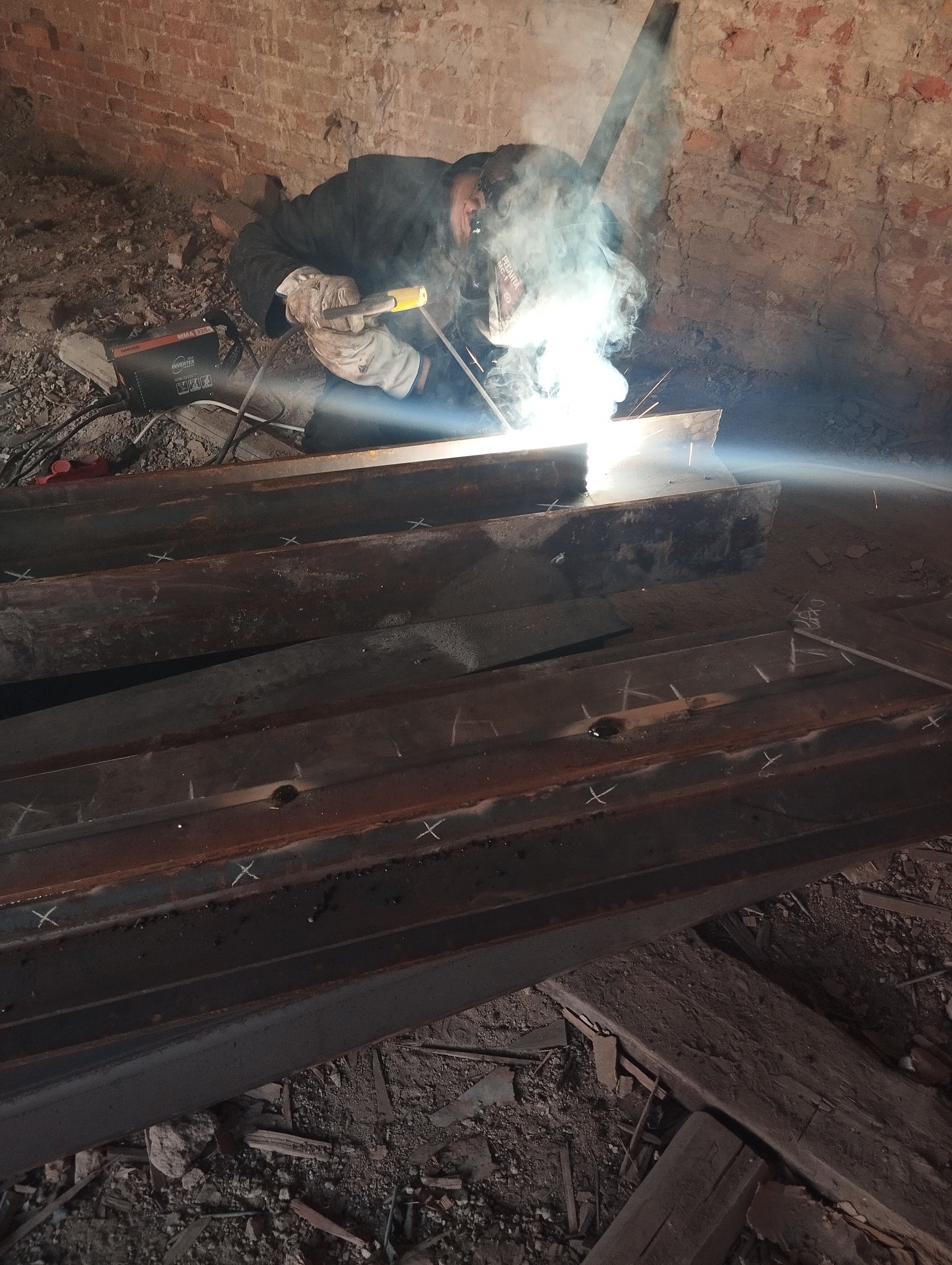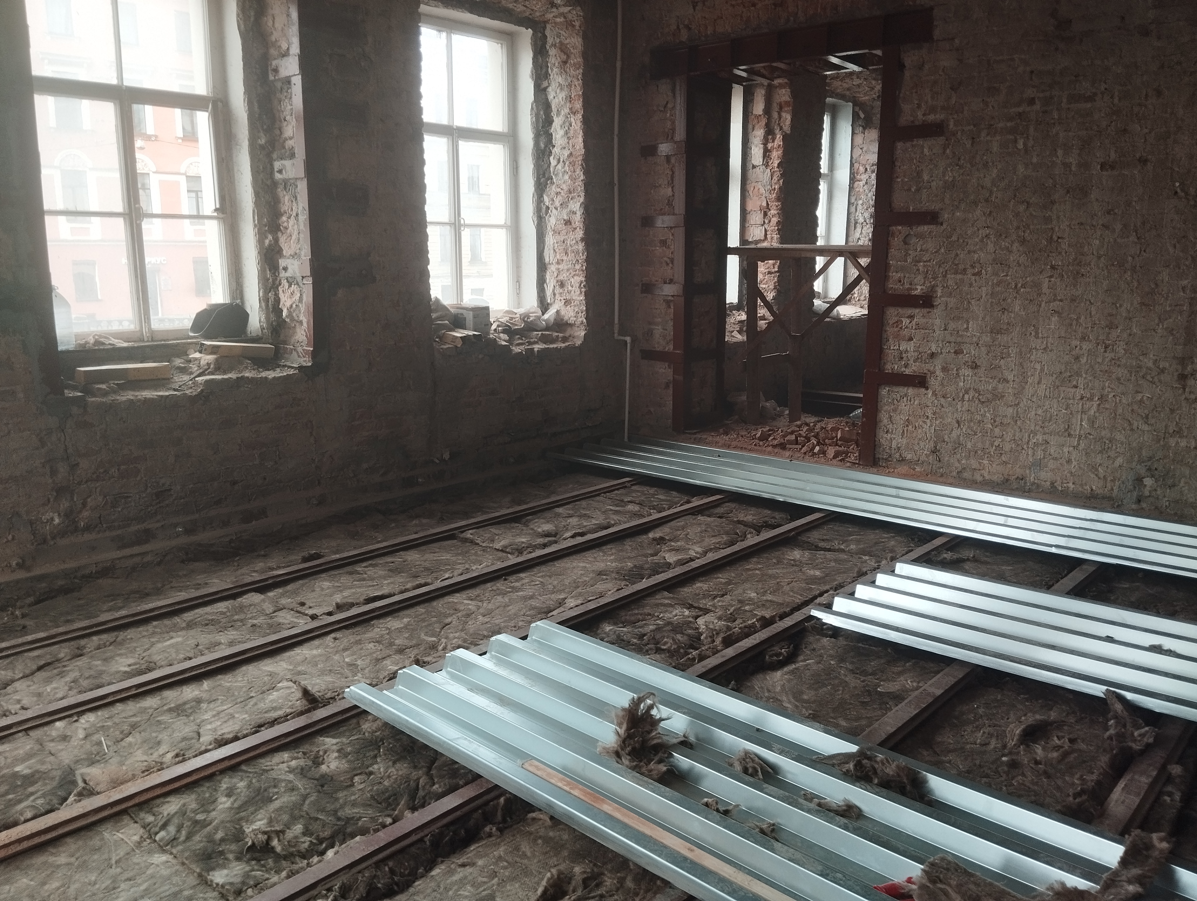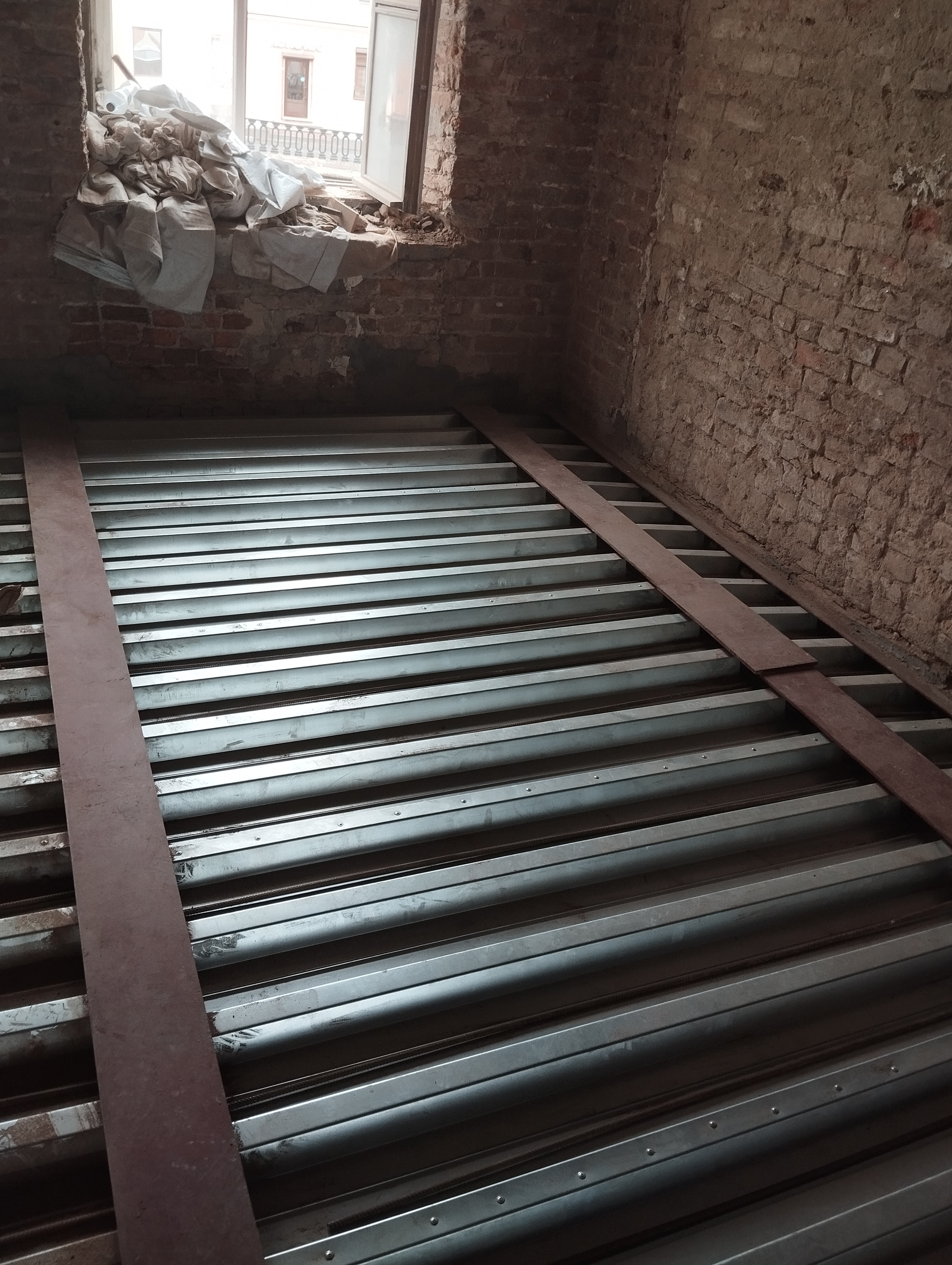 Демонтаж деревянных балок в старом фонде. Замена на стальные усиленные балки. Укладка Профлиста с армированием и заливкой бетона.