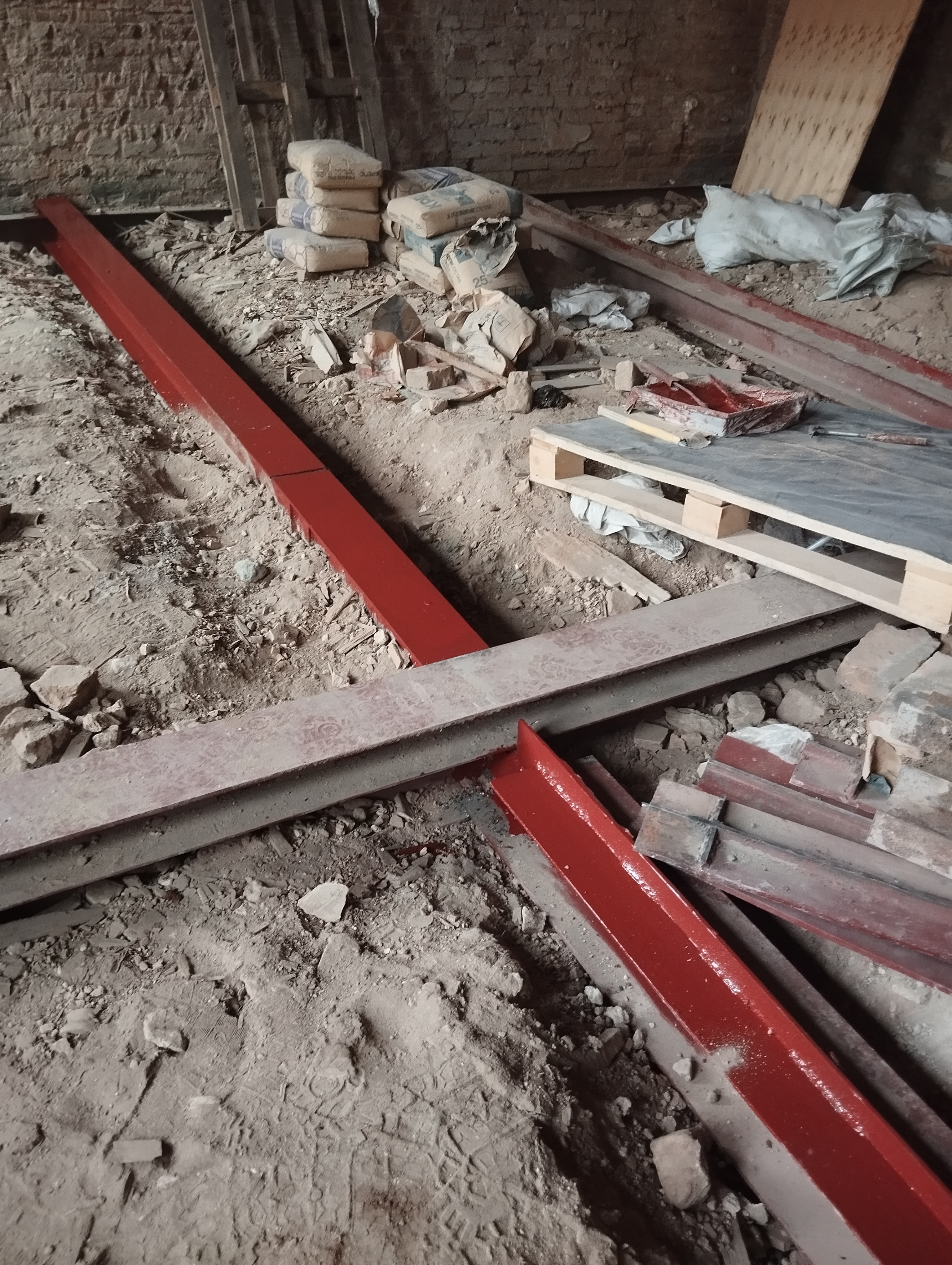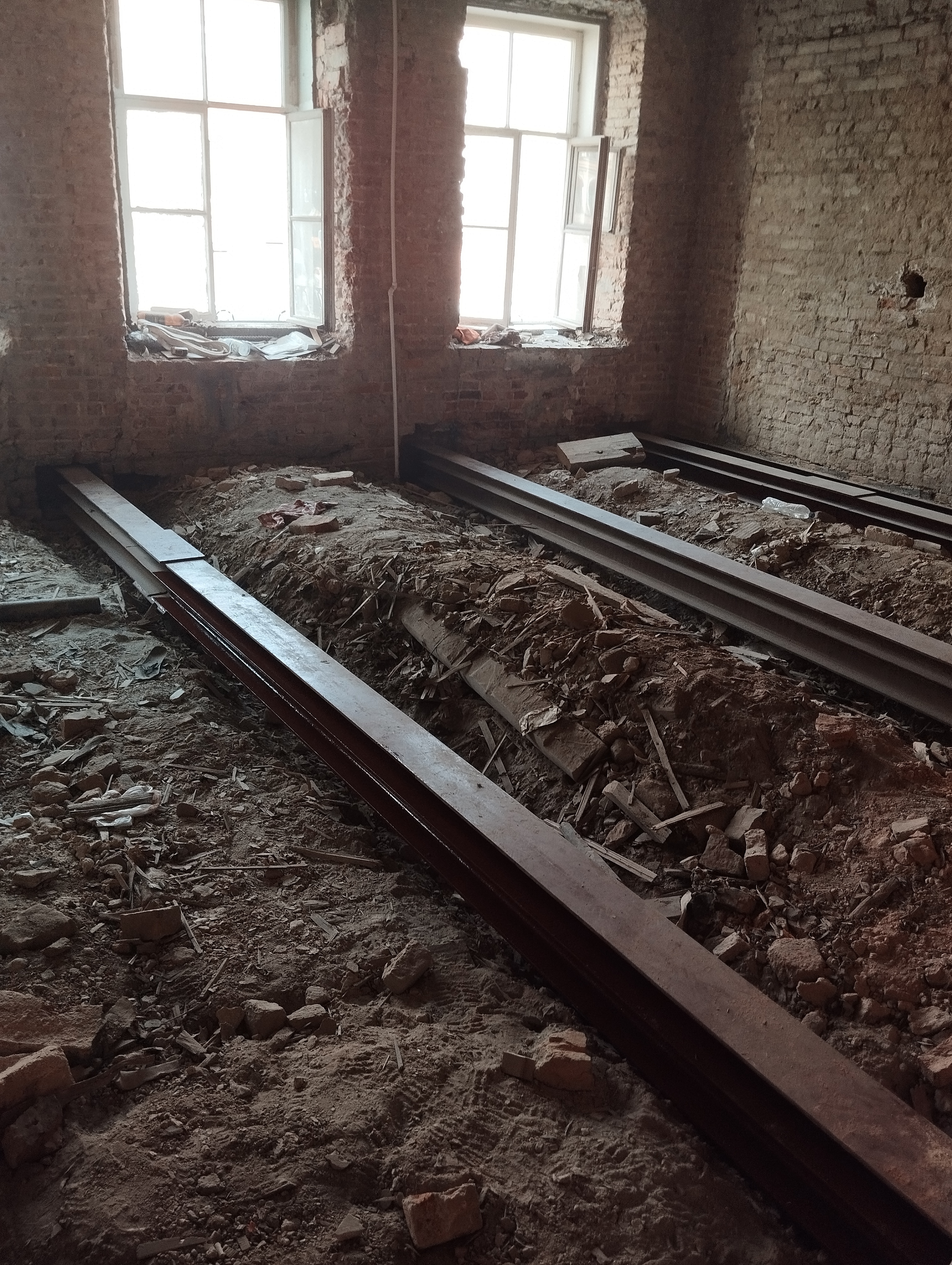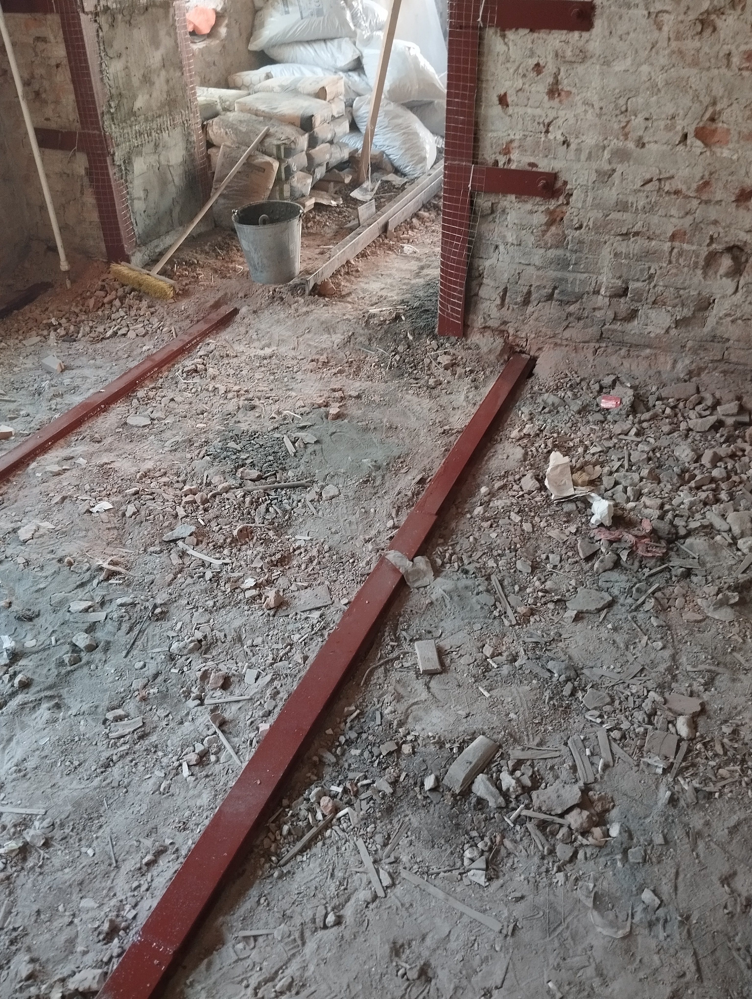Демонтаж деревянных балок в старом фонде. Замена на стальные усиленные балки. Укладка Профлиста с армированием и заливкой бетона.